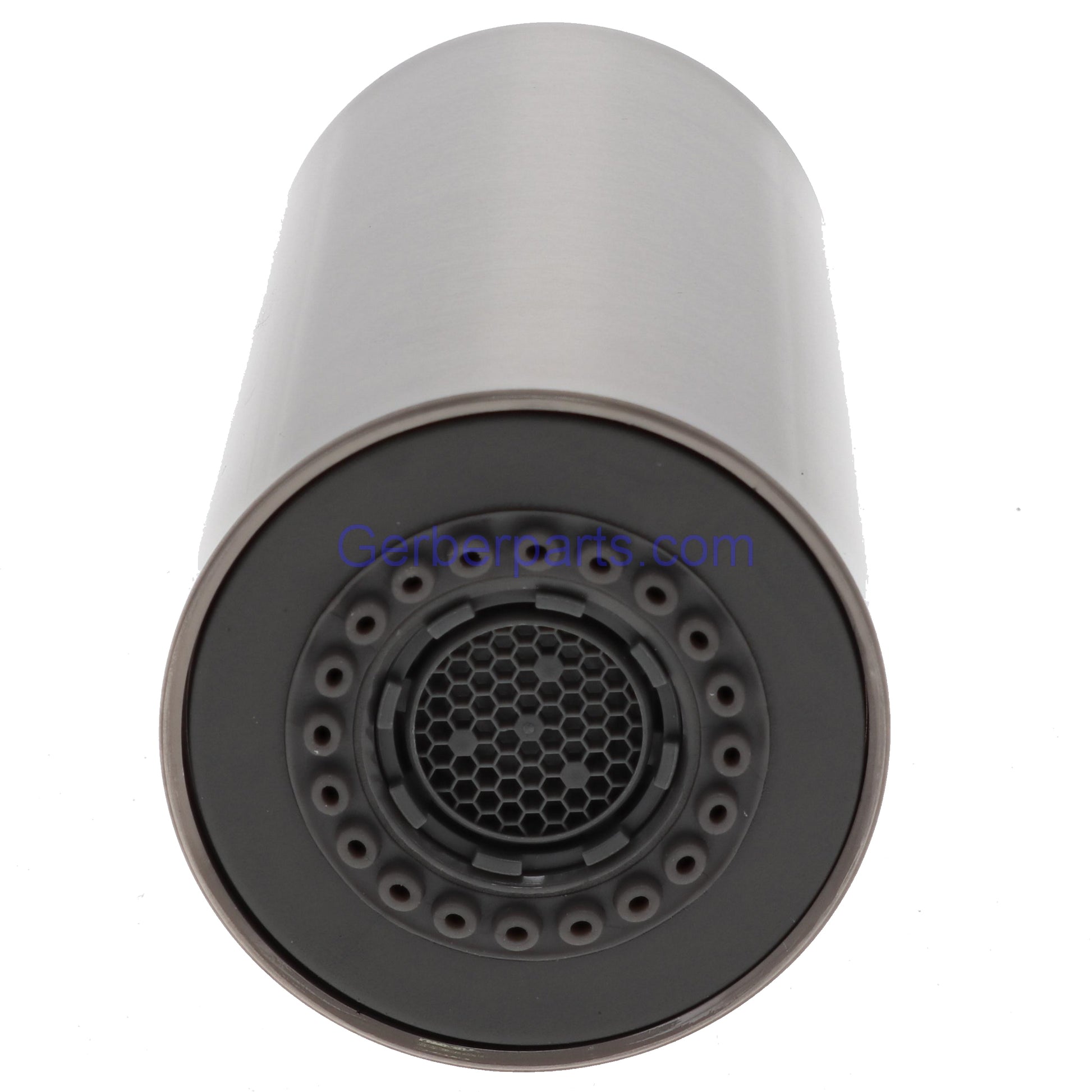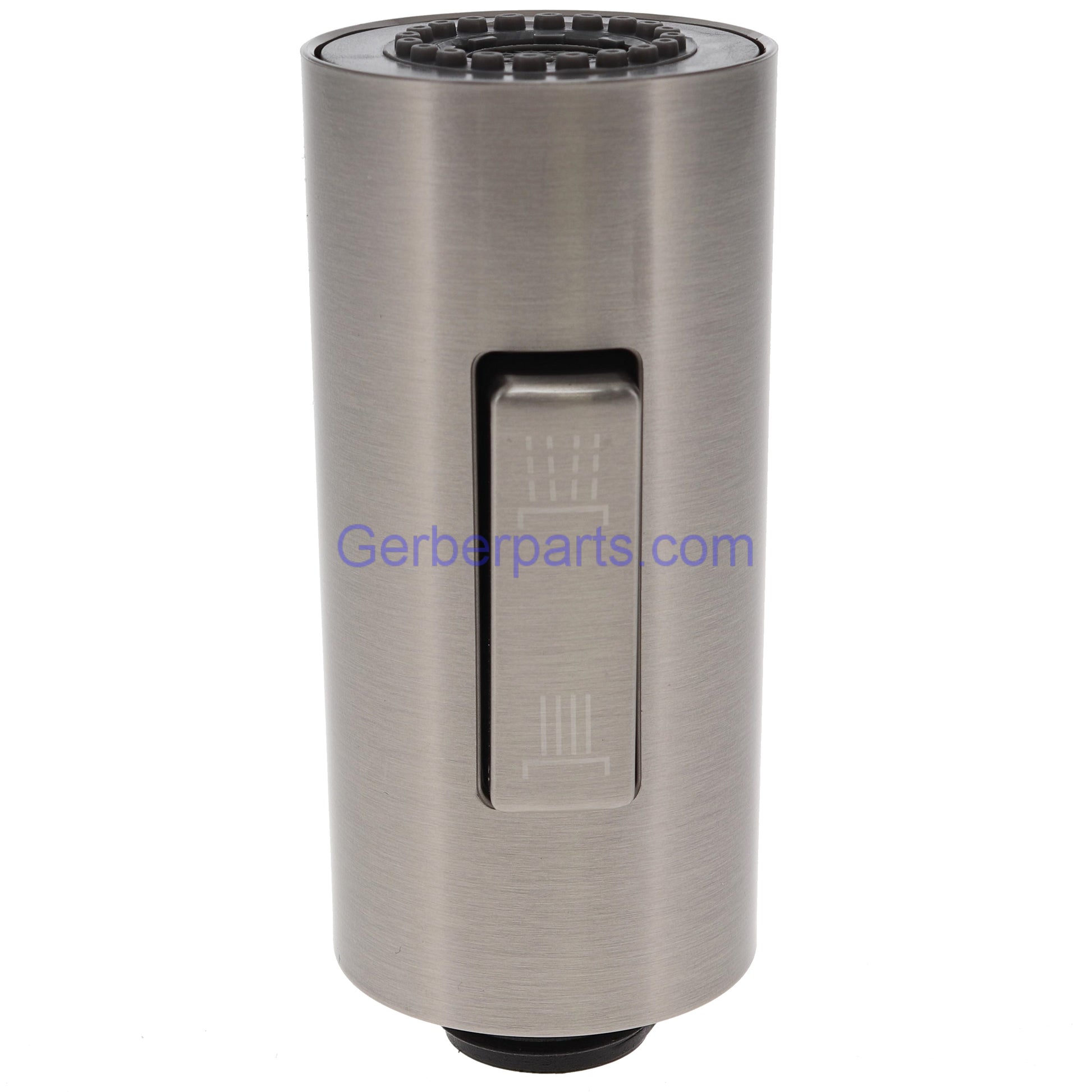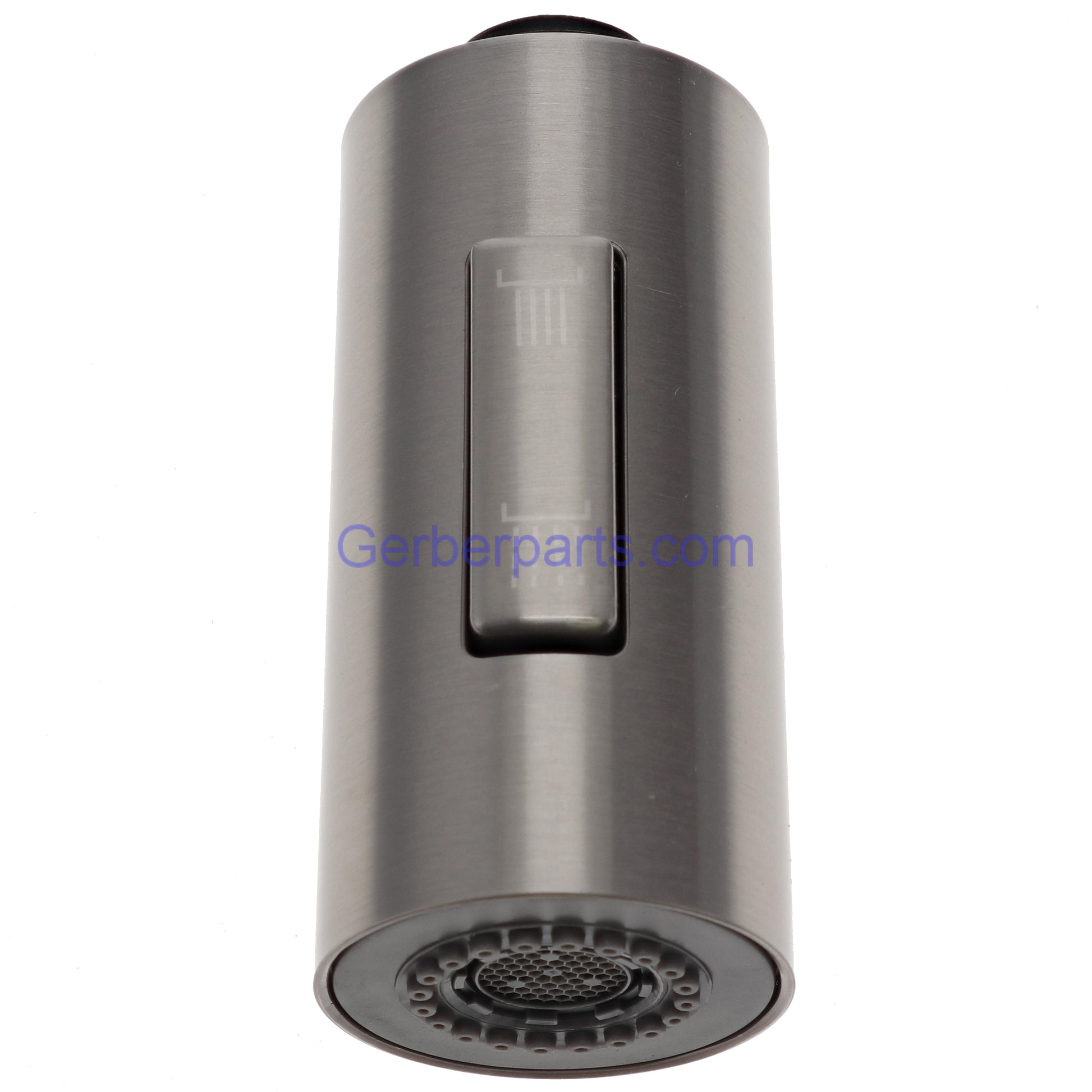 Genuine Gerber A568055NNP-51 brushed nickel spray head. This spray head is designed for the Gerber pre rinse faucet model D451288. The total length of the spray head, measured from the top of the thread to the bottom of the spray head is approximately 3 1/2 inches. The outer diameter of the threads is roughly 3/4 of an inch. The A568055NNP-51 comes complete with the selector switch, and the aerator. This sprayer offers 2 different spray functions. One being the wide spray, and the other being the center spray.
