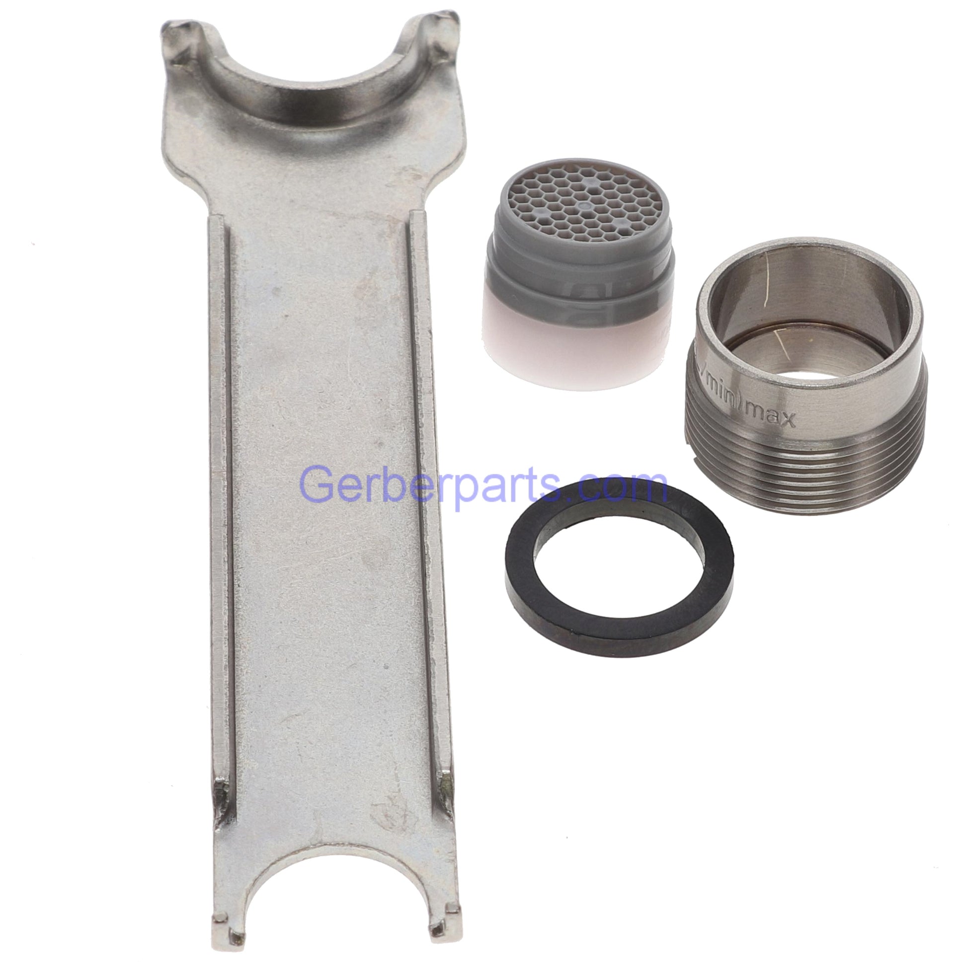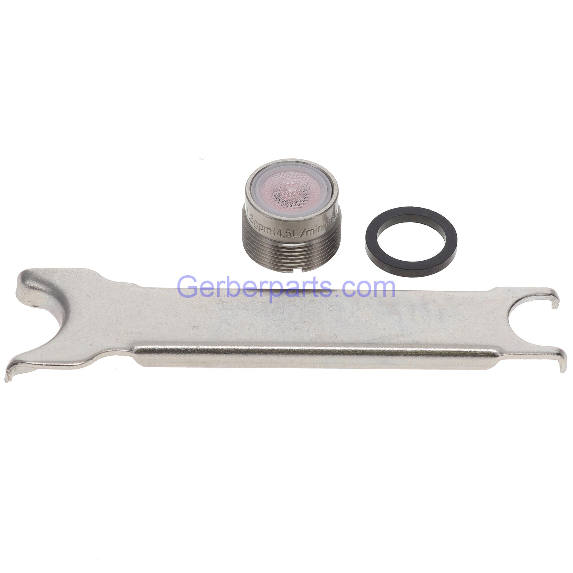 Genuine Gerber A613095NNP-61 brushed nickel aerator. This aerator will use 1.2 gallons per minute. Comes with the aerator, and wrench. This aerator is used in the bathroom faucet models D230658, D236158, D222530, and D224530.